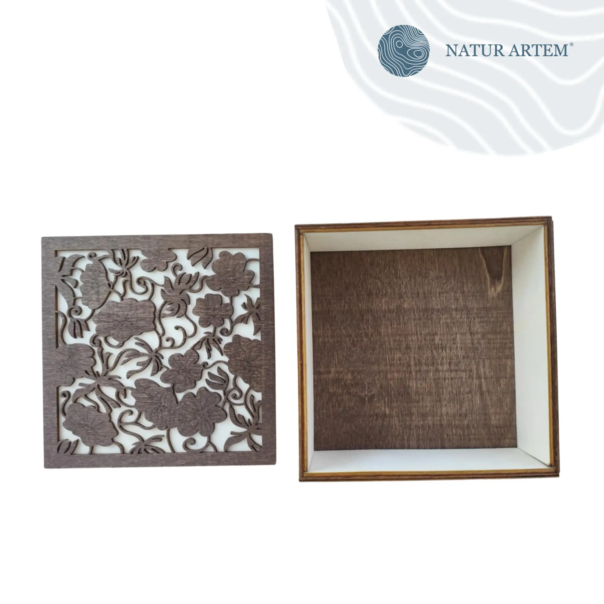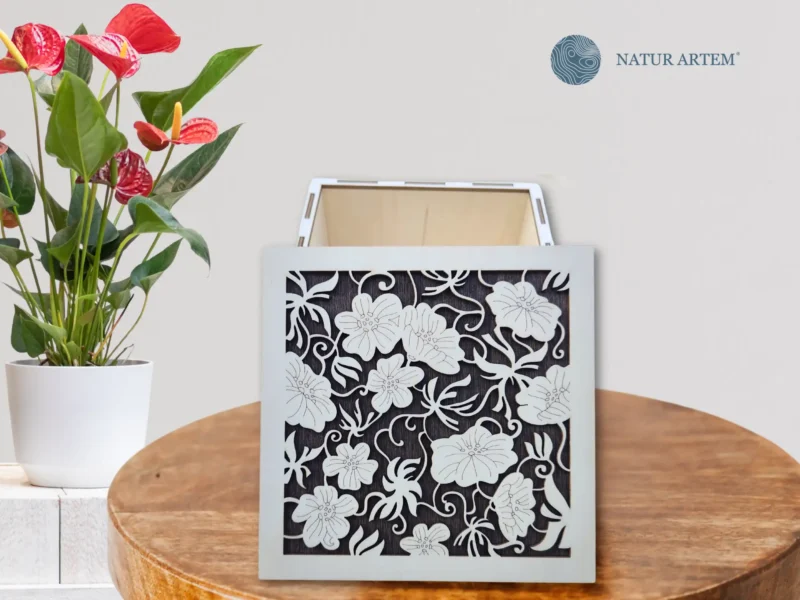 💻 Technológia: Detailné laserové gravírovanie kvetov na veku, ktoré zvýrazňuje krásu a jemnosť motívov